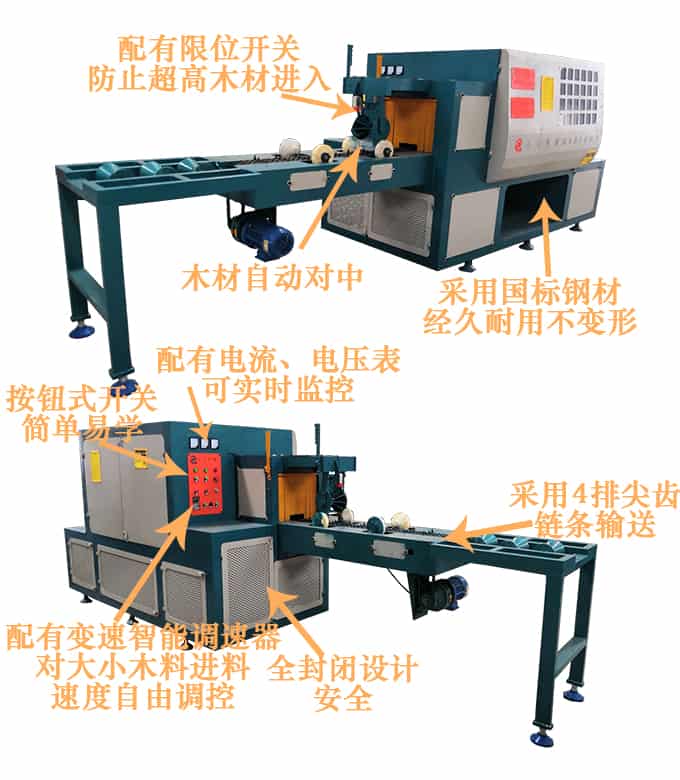 送 料:采用四排尖齒鏈條輸送,機上配有變頻智能調速器,可以對大小木料的進料速度實行自由調速。原木可以實現自動分中,機上還配有限位開關,防止超去規格木料進入,防止卡木避免對機器造成損壞。